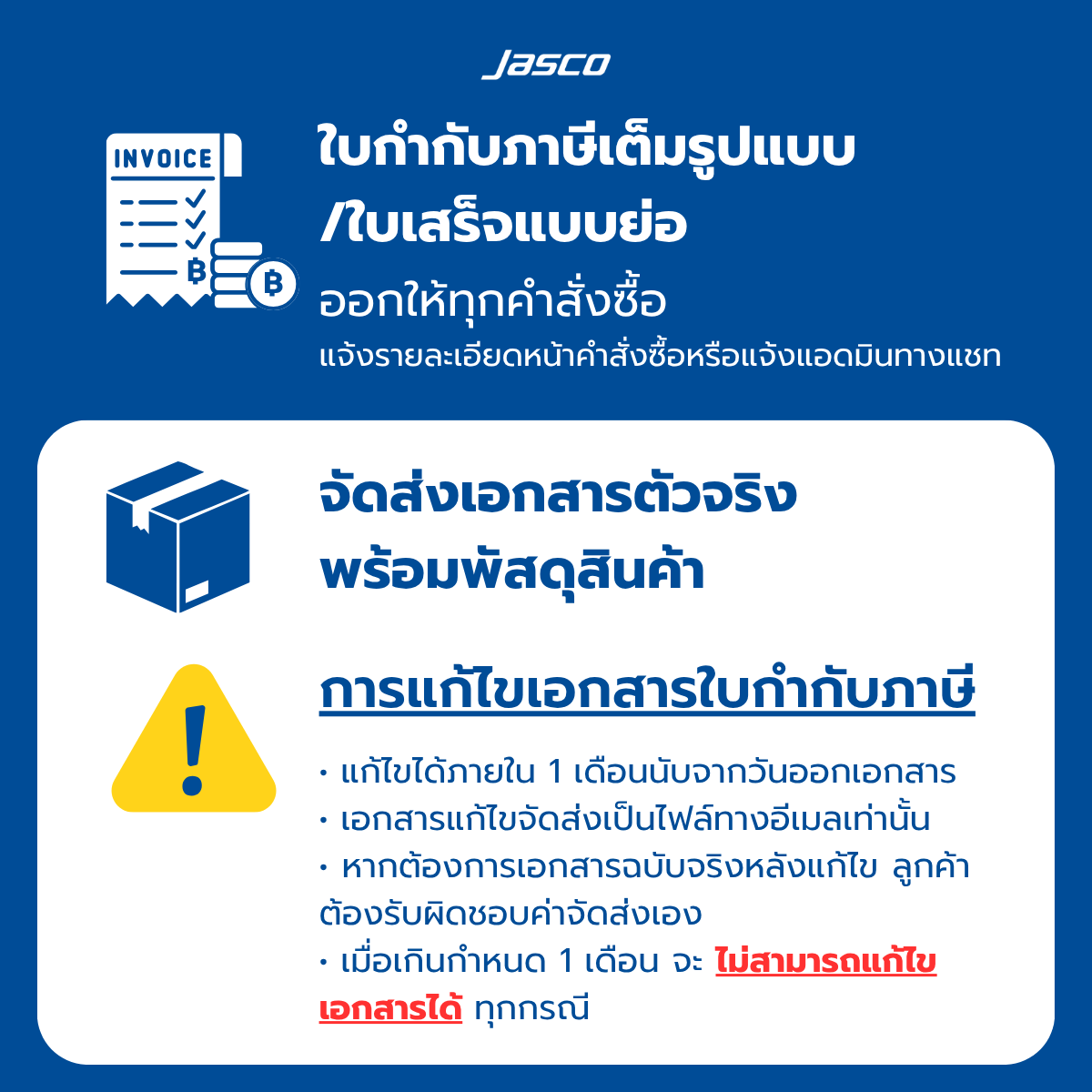 สามารถออกใบกำกับภาษีเต็มรูปแบบและใบเสร็จแบบย่อได้ทุกคำสั่งซื้อ โดยจะจัดส่งเอกสารตัวจริง พร้อมสินค้าทุกออเดอร์